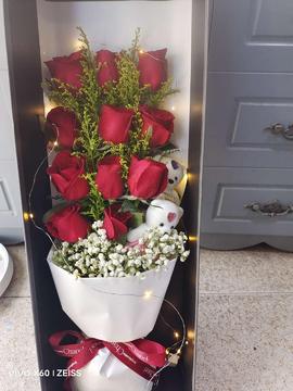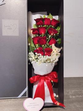 材料 | 11枝卡罗拉红玫瑰、搭配白色满天星、黄莺点缀,两只小熊(款式随机),随机赠送彩灯一串。 |