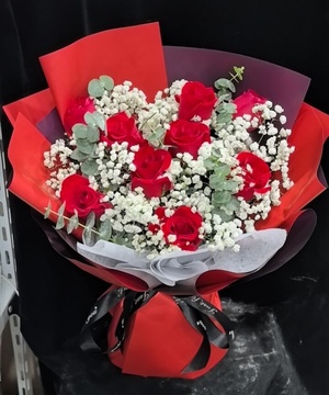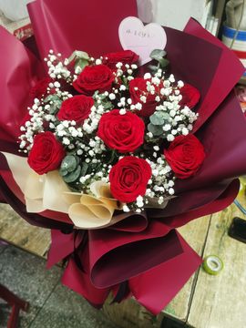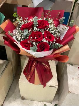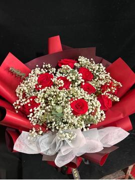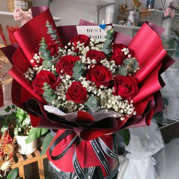 | 材料 | 9枝卡罗拉红玫瑰搭配白色满天星、尤加利叶装饰。 |