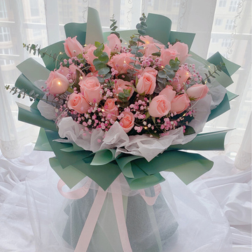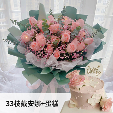| 材料 | 33朵精品粉色戴安娜玫瑰,搭配满天星、尤加利叶装饰。赠送彩灯一根+圆形奶油水果蛋糕,新鲜优质奶油水果,水果夹层蛋糕胚,三朵精品爱莎玫瑰装饰。尺寸可选择。 |