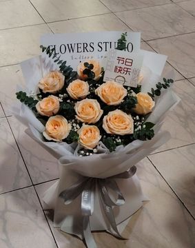 | 材料 | 11朵香槟玫瑰,尤加利叶点缀搭配 |