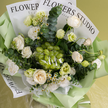 | 材料 | 水果花束:葡萄一串,5枝白玫瑰,7枝白桔梗,喷泉草、松虫草、尤加利叶间插 |