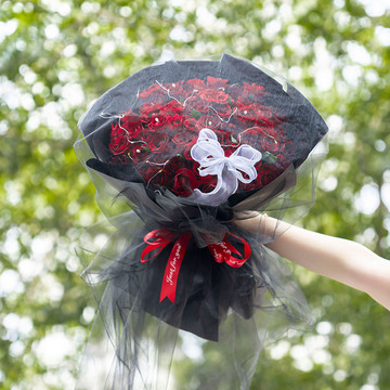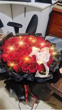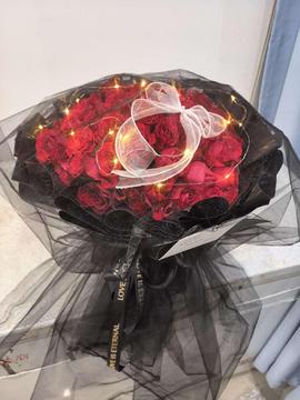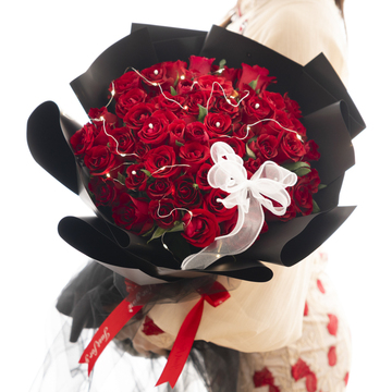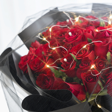 | 材料 | 52枝精品红玫瑰,栀子叶间插,蝴蝶结装饰,送彩灯一串。 |