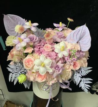 | 材料 | 11支粉荔枝玫瑰,5支海洋之歌玫瑰,5支紫色(吸色)郁金香,1支紫色绣球,搭配粉色松虫草,1支六出粉百合,紫色紫罗兰,粉色多头康乃馨,紫桔梗,紫色高山羊齿(喷色)2支紫色红掌(喷色),粉色蓬莱松(喷色)丰满间插 |