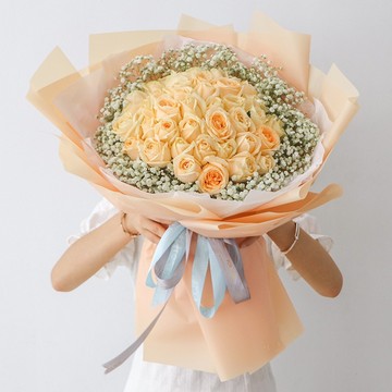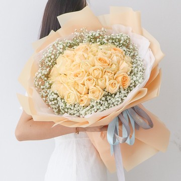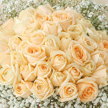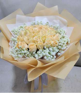 | 材料 | 33枝香槟玫瑰,外围白色满天星丰满 |