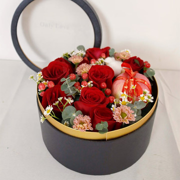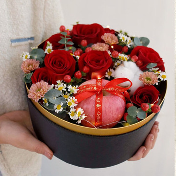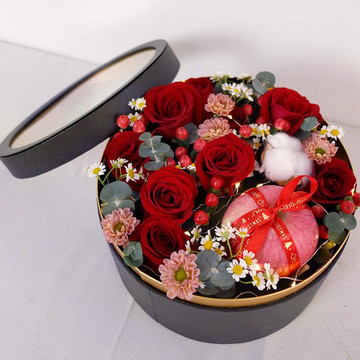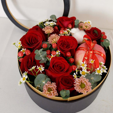 | 材料 | 9枝精品红玫瑰、1颗苹果、1朵棉花,红豆、尤加利叶、小雏菊间插、搭配一条彩灯 |