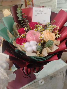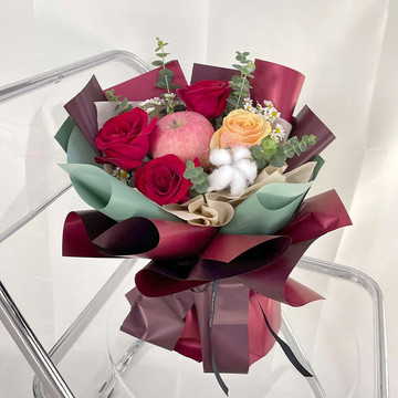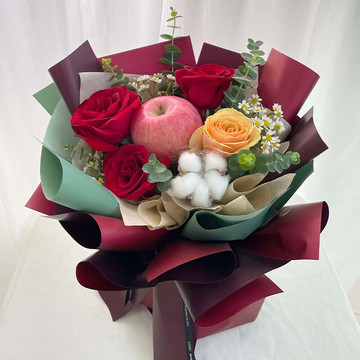| 材料 | 3枝精品红玫瑰、1枝香槟玫瑰、1朵棉花、1颗苹果,尤加利叶、小雏菊间插 |
