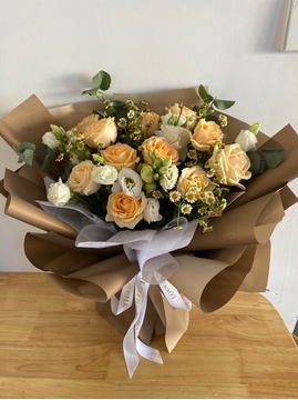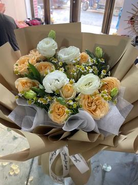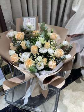 | 材料 | 11枝精品香槟玫瑰,5枝白色洋桔梗,小雏菊、绿叶间插丰满。 |
