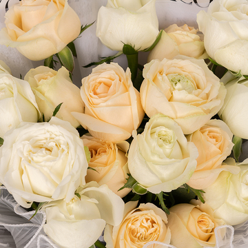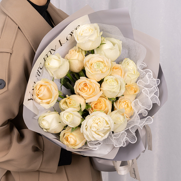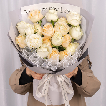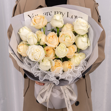 | 材料 | 10枝香槟玫瑰,9枝白玫瑰。 |