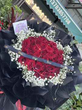 | 材料 | 33枝卡罗拉红玫瑰,白色满天星围边,1灯串,表面覆黑纱 |