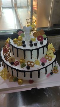 材料 双层圆形鲜奶蛋糕,水果夹层,巧克力流边装饰,巧克力球、焦糖饼干,其他配件如图装饰。