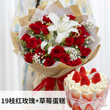 材料 19朵红玫瑰,1枝多头百合,满天星丰满点缀,黄莺间插+奶油草莓圆形蛋糕