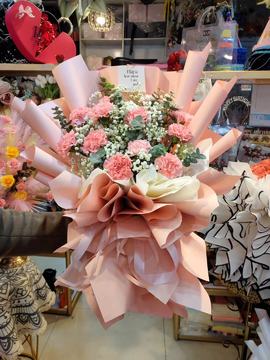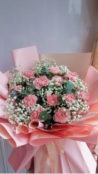 | 材料 | 12朵粉色康乃馨,白色满天星丰满,尤加利叶间插。 |