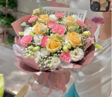 | 材料 | 8朵粉色康乃馨,5朵香槟玫瑰,3枝多头白色桔梗,白色紫罗兰、尤加利叶点缀。 |