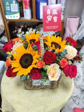 | 材料 | 12朵红色卡罗拉玫瑰,3朵香槟玫瑰,2朵红色康乃馨,3朵向日葵,3枝多头橙色泡泡玫瑰,相思豆、尤加利叶点缀 |