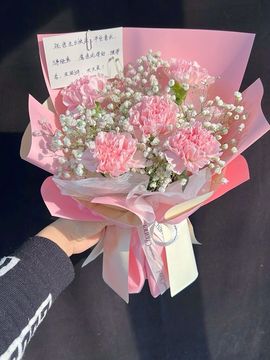 | 材料 | 5枝粉色康乃馨,白色满天星、尤加利叶点缀 |