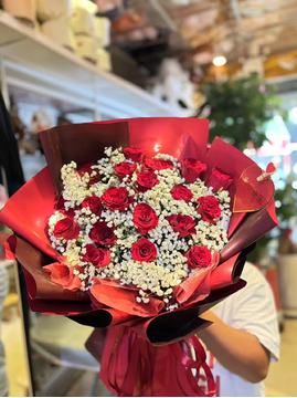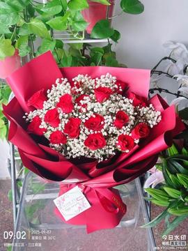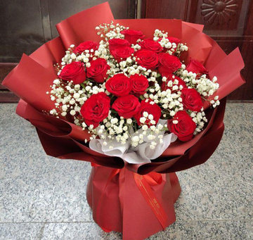 材料 | 19朵红色卡罗拉玫瑰,白色满天星间插丰满。 |