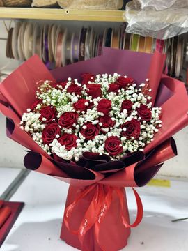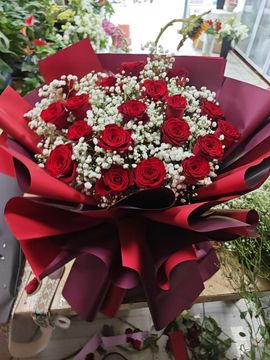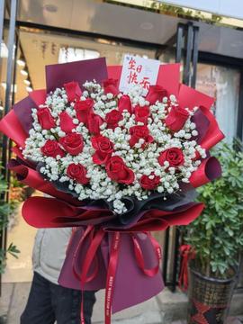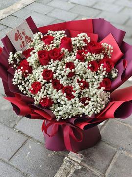 | 材料 | 19朵红色卡罗拉玫瑰,白色满天星间插丰满。 |