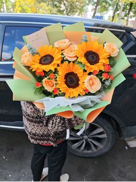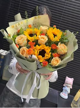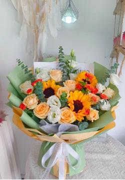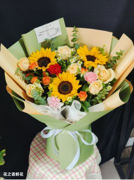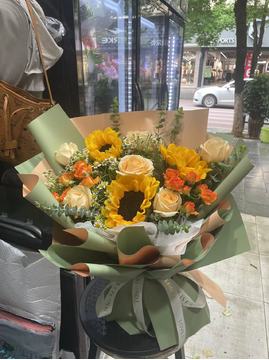 | 材料 | 3朵向日葵,6枝香槟玫瑰,2枝多头橙色泡泡玫瑰,尤加利叶、洋甘菊点缀。 |