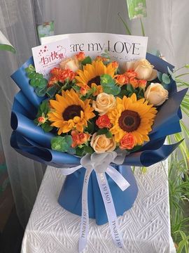 | 材料 | 3枝向日葵、5枝香槟玫瑰、3枝橙色多头玫瑰、尤加利叶点缀 |