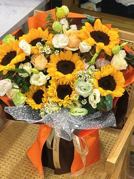 材料 | 7朵向日葵,2朵香槟玫瑰,5枝多头各色桔梗(粉、白、绿色、香槟色桔梗按图搭配),尤加利叶、洋甘菊点缀。 |