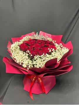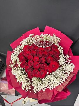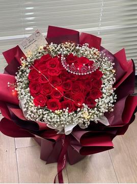 材料 | 33枝拉罗拉红玫瑰,白色满天星围边装饰,下单即送1灯串1皇冠 |