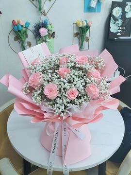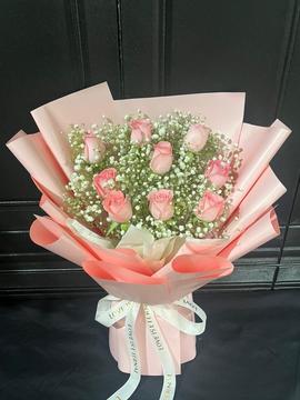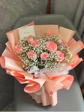 材料 | 9枝戴安娜粉玫瑰,白色满天星间插丰满。 |