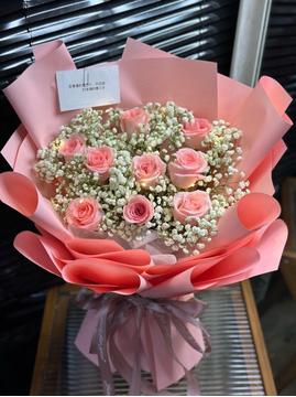 | 材料 | 9枝戴安娜粉玫瑰,白色满天星间插丰满。 |