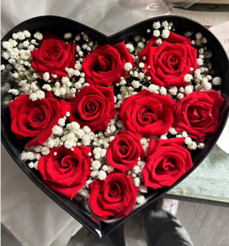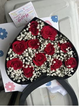 | 材料 | 11枝卡罗拉红玫瑰,白色满天星间插丰满装饰。 |