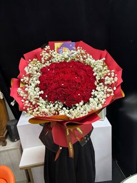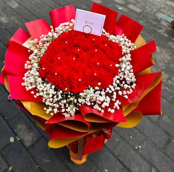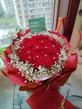 | 材料 | 33枝红色康乃馨,白色满天星围边装饰,珍珠点缀。 |