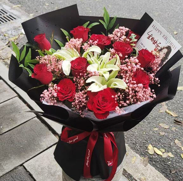 材料 | 11朵红玫瑰,2枝多头白百合,尤加利间插,粉色满天星丰满 |