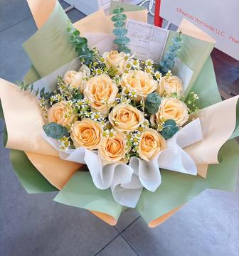 材料 | 11支香槟玫瑰,洋甘菊和尤加利间插、下单即送一灯串 |