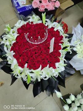 99朵卡罗拉红玫瑰,20枝多头白百合围边装饰,下单即送皇冠一顶