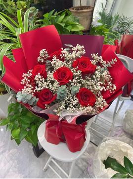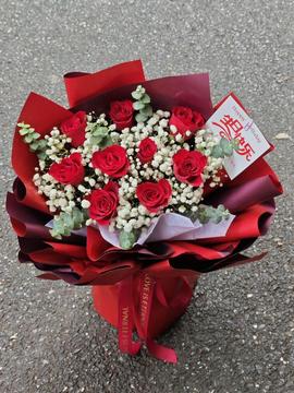 | 材料 | 6枝红玫瑰,白色满天星丰满,尤加利叶间插。 |