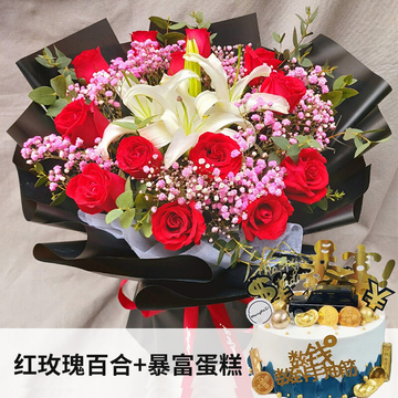| 材料 | 11朵红玫瑰,2枝多头白百合,尤加利间插,粉色满天星丰满+圆形鲜奶蛋糕,水果夹层,巧克力,汽车,暴富配件如图装饰 |