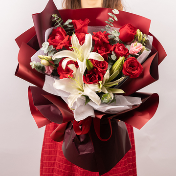 材料 11枝卡罗拉红玫瑰、2枝多头白百合搭配粉桔梗、大叶尤加利叶+奶油裱花,水果夹层,食用珍珠点缀,外围巧克力碎(或椰蓉替代)