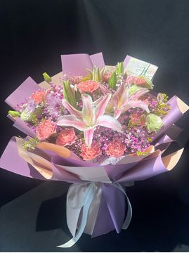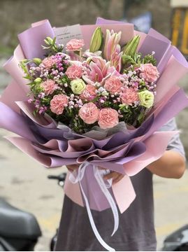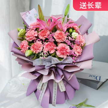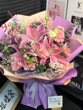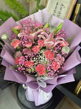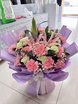 | 材料 | 11枝粉色康乃馨,2枝多头粉百合,绿色洋桔梗,绿铃草,粉色、白色满天星,紫色小菊间插点缀 |