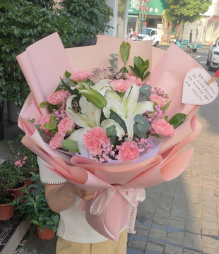 | 材料 | 11枝粉色康乃馨,1枝多头白百合,尤加利叶间插点缀 |