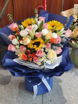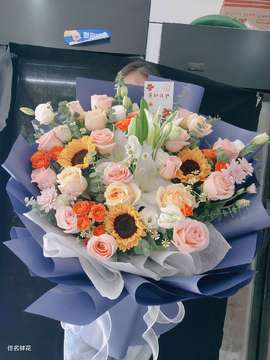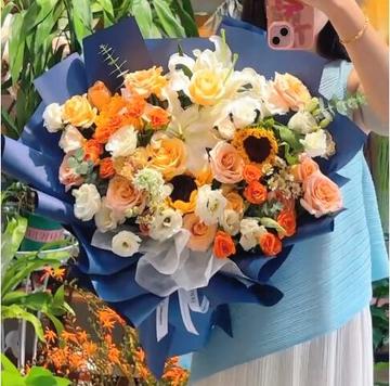| 材料 | 15朵微光玫瑰,4朵香槟玫瑰,3朵向日葵,4枝多头橙色泡泡玫瑰,5枝多头白色洋桔梗,1枝白色多头白百合,尤加利叶、小雏菊点缀。 |