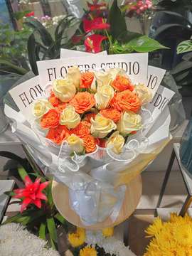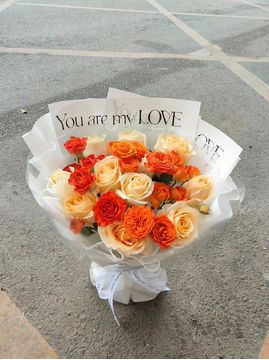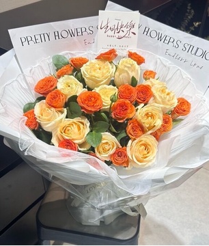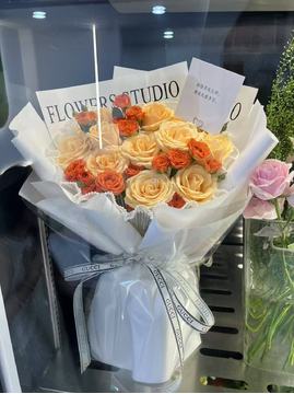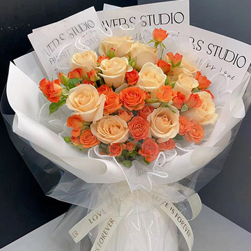 | 材料 | 11枝香槟玫瑰,11枝多头橙色泡泡玫瑰 |