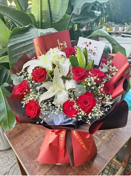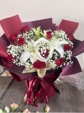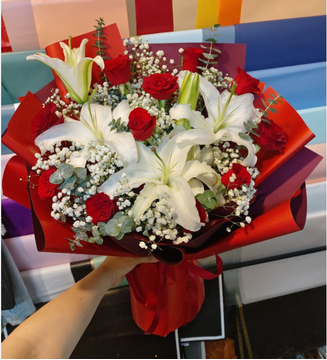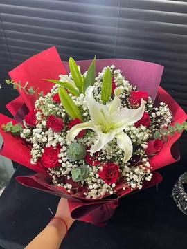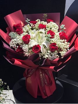 | 材料 | 11枝红玫瑰,2枝多头白百合,白色满天星、尤加利叶间插丰满。 |