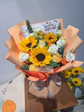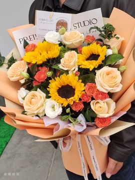 | 材料 | 3朵向日葵,5朵香槟玫瑰,3枝多头橙色泡泡玫瑰,1枝多头白色洋桔梗,尤加利叶、小菊点缀。 |