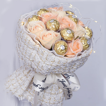 | 材料 | 9颗费列罗巧克力,9朵香槟玫瑰(巧克力花束),下单即送1灯串 |