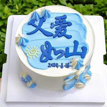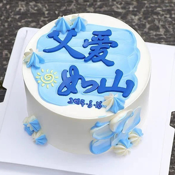 | 材料 | 圆形鲜奶蛋糕,如图蓝色奶油裱花点缀,父爱如山文案装饰。 |