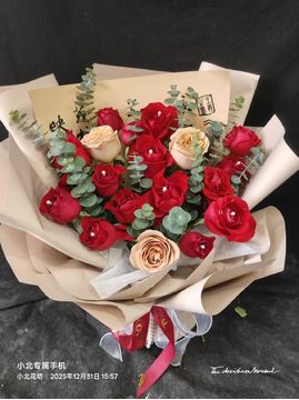 | 材料 | 16枝卡罗拉红玫瑰,3枝卡布奇洛,尤加利叶间插点缀丰满,装饰珍珠点缀。 |