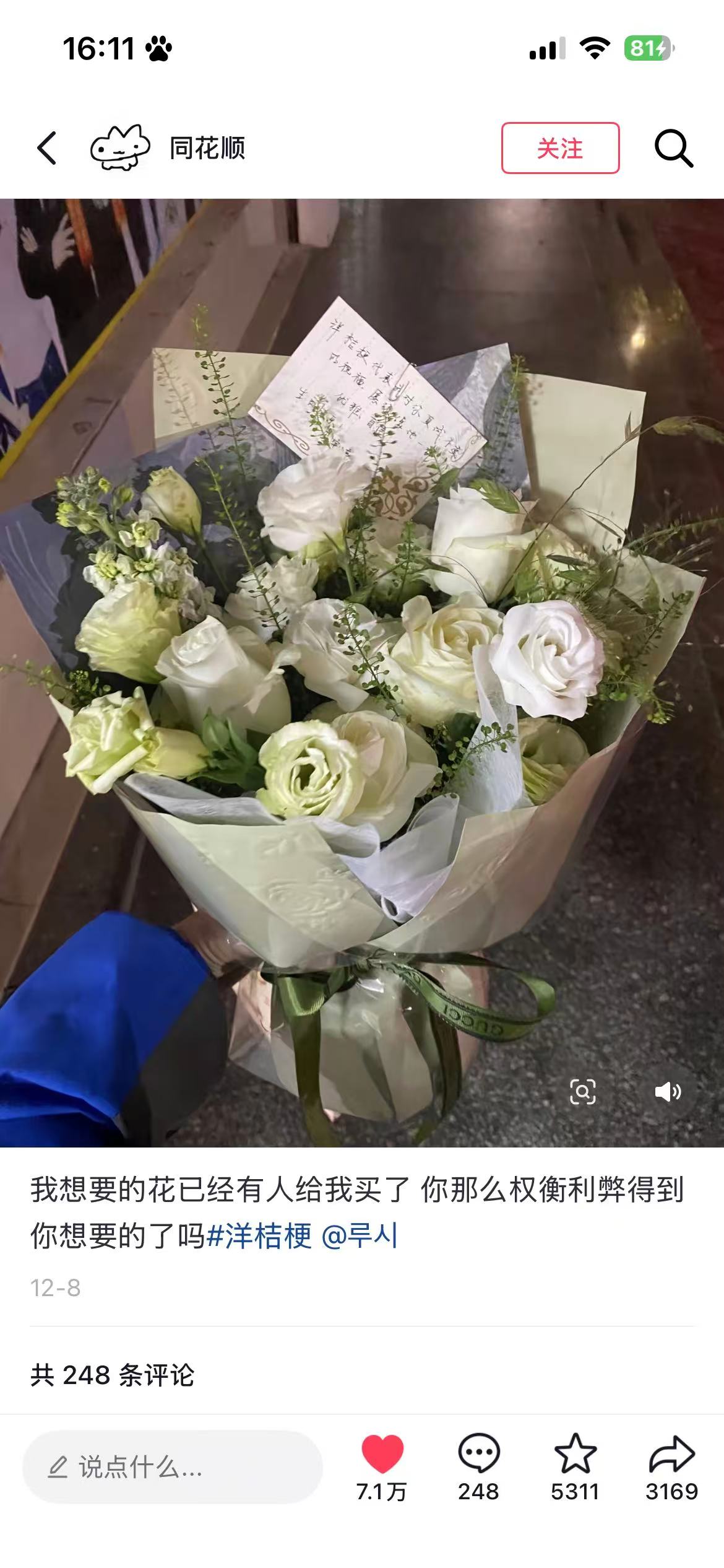 | 材料 | 19枝卡罗拉红玫瑰,4枝多头白百合,尤加利叶间插点缀 |