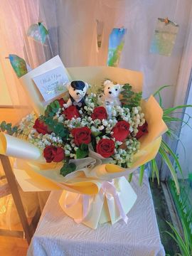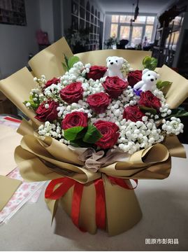 | 材料 | 11枝卡罗拉红玫瑰,白色满天星、尤加利叶间插点缀丰满。下单即送一对可爱小熊公仔。 |