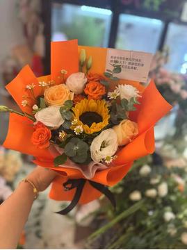 材料 | 1朵向日葵,2朵香槟玫瑰,白色洋桔梗、橙色多头泡泡玫瑰、尤加利叶、洋甘菊如图间插点缀 |