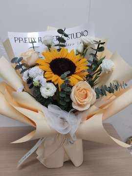 | 材料 | 1朵向日葵,2支香槟玫瑰,2支多头白色洋桔梗、白色小雏菊、尤加利叶如图间插点缀。 |