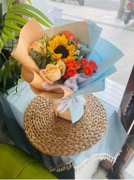 | 材料 | 1朵向日葵,2朵香槟玫瑰,白色洋桔梗、橙色多头泡泡玫瑰,尤加利叶、洋甘菊如图间插点缀 |