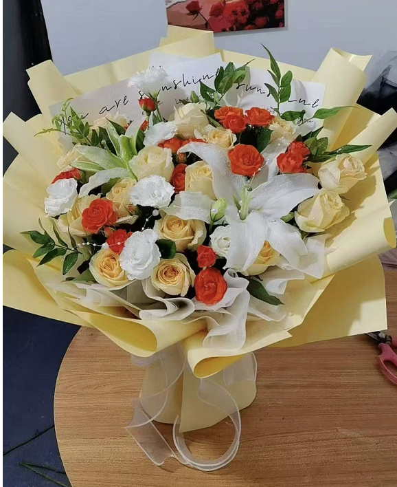 | 材料 | 1朵向日葵,3支白色桔梗,2支香槟玫瑰,尤加利叶、小雏菊如图间插点缀。 |